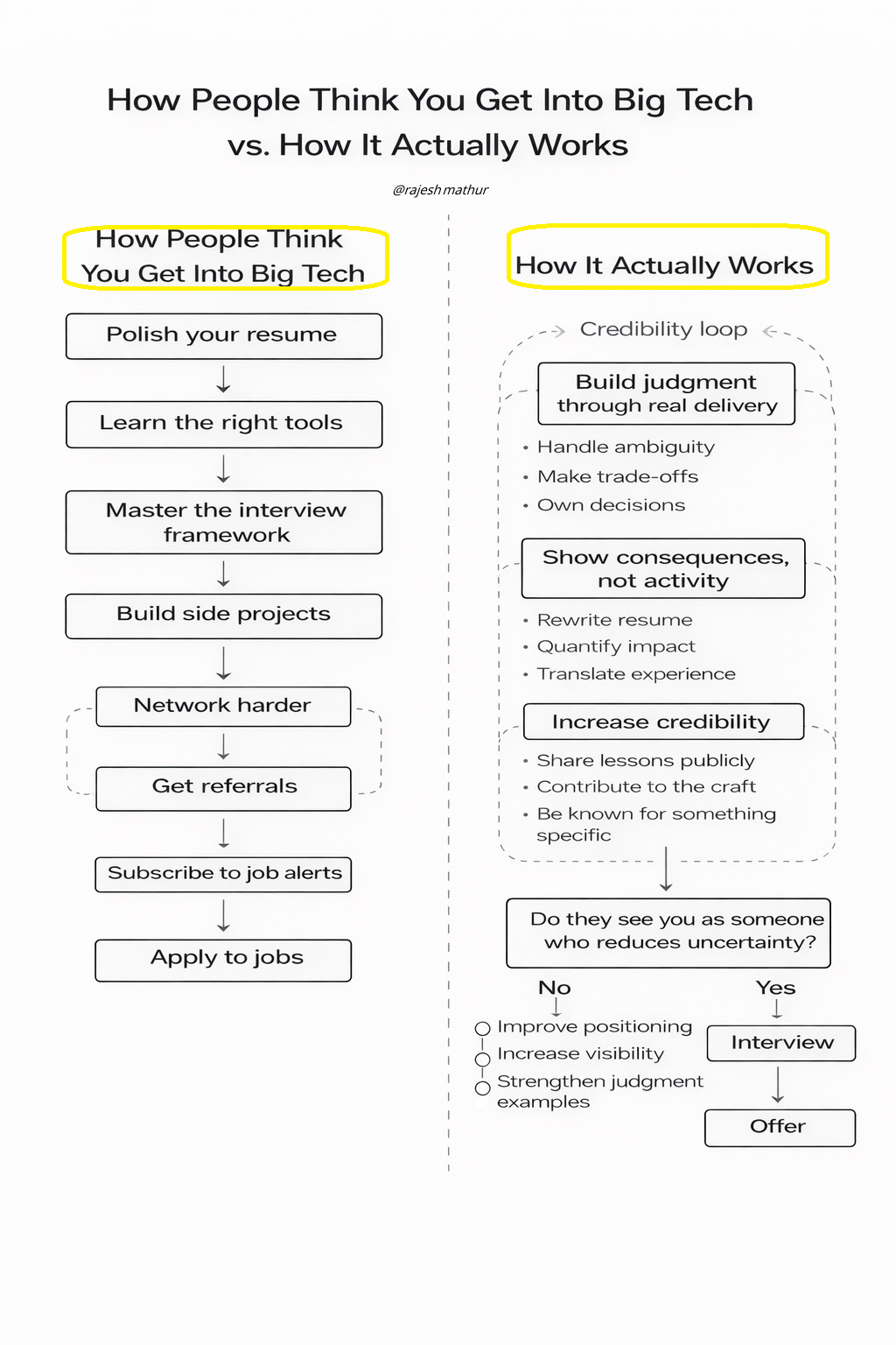Every year, I see articles, YouTube videos and LinkedIn posts promising a shortcut into Big Tech roles. Polish your resume. Learn the right tools. Master the interview framework. Build side projects. Network harder.